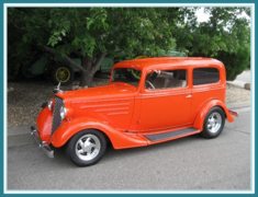 After completing a big block Chevy powered T bucket roadster in the mid 80′s it was my new wild ride. I always enjoyed driving it in the ColoRODan’s cruise to Estes Park each year even though I seemed to get caught in the afternoon rain without fail. After many years of enduring rain and bugs I thought I would build a rod with a roof and windows. I found a real nice stock 1937 Chevy sedan and started making plans for its transformation. In 1997 I went to the Street Rod Nationals in Pueblo to go parts shopping for it when I ran across a Hugger Orange 1935 Chevy sedan in the show for sale, I was there to buy parts, not a car. I like building my own projects but I really liked it and the price was surprisingly low, I could not pass it up. I have made numerous changes on it to suit me and now have about 60,000 miles on it, great road machine! It’s been to the West Coast to KY and all over in between. Usually go on at least one big trip each year with fellow club members, truly my favorite part of being a “Street Rodder” and hope to do this for many years to come.